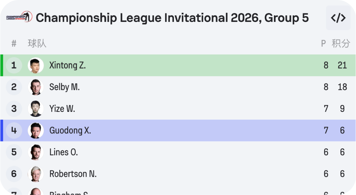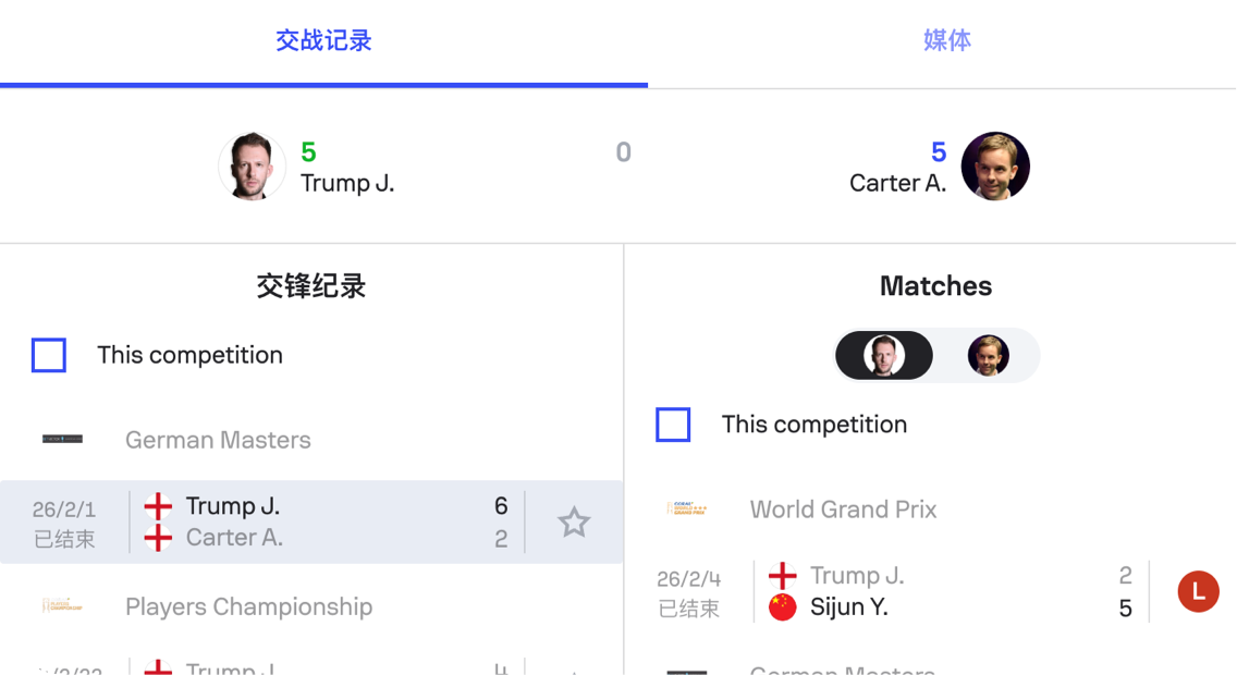 斯诺克赛事数据产品-比分数据